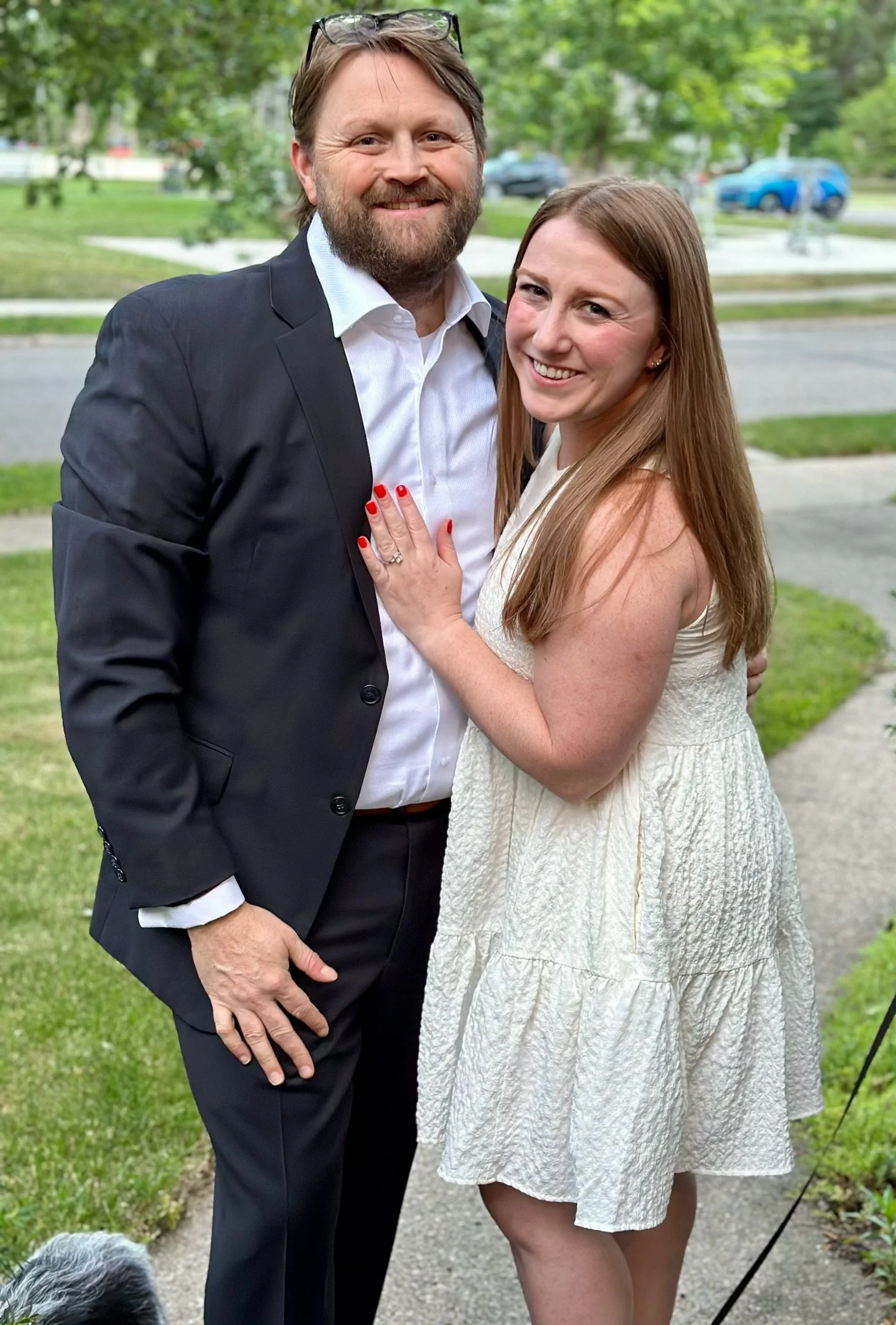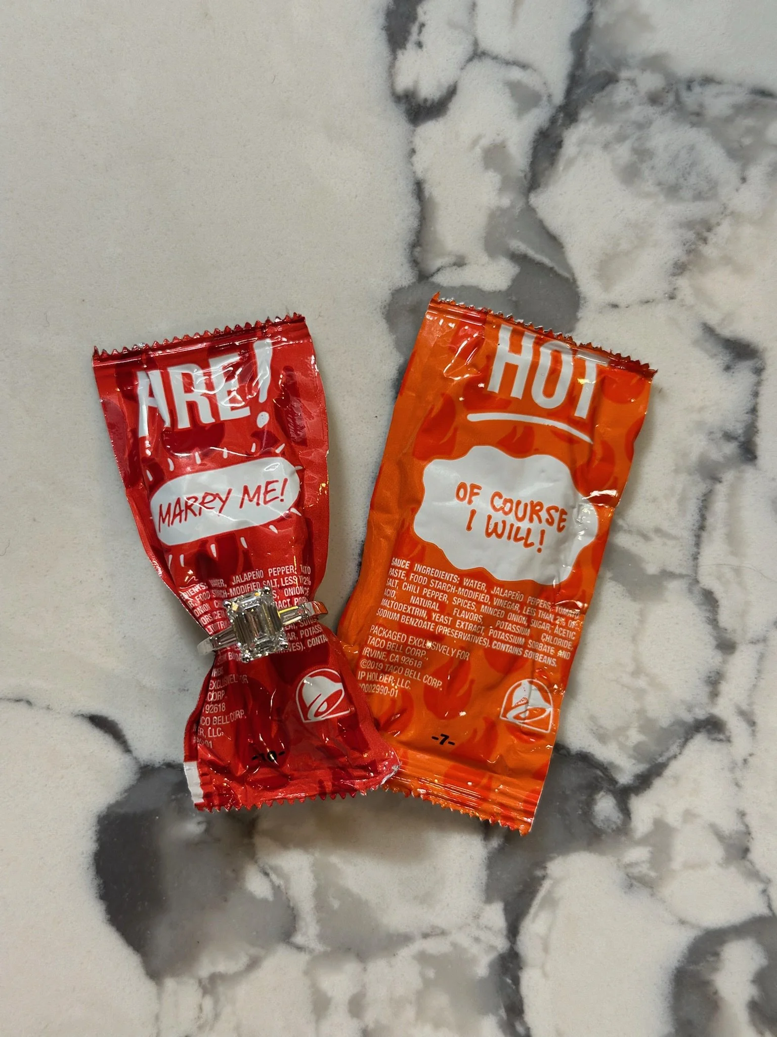 Eric gathered a whole bunch of things that he knew Kate would love - a little “love fern” plant (rom-com movie reference IYKYK), all her favorite items from Taco Bell PLUS an extra taco for Rufus, a card with all the things he loved about her (he wrote it out in the card since he figured Kate would realize what was happening before he had a chance to say any of it, which is exactly what happened), and a candle because she is ‘the light of his life.’ He donned his suit (Kate loves men’s suiting) and surprised her at her house. Kate immediately figured out what was going on and before he could get almost any words out, or even set down everything in his arms, she was already crying. In Kate’s kitchen, Eric got down on one knee with the “Marry Me” Taco Bell sauce packet in one hand and the ring in the other, and of course she said yes!